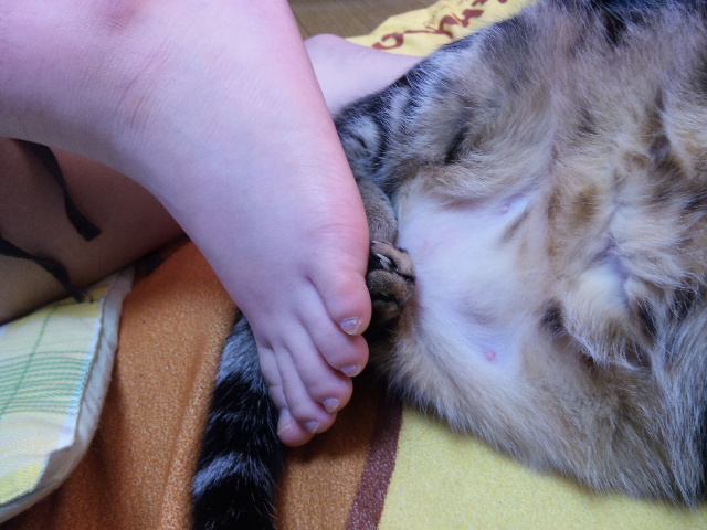 最近、我が家の猫は、娘の足フェチです。娘の足に頭を乗せたり、くっついたりしてます。ちょっと前までは、逆に娘を無視していたのに、最近は構ってオーラ満載です。私には、必ずご飯ちょうだいと言ってきます。